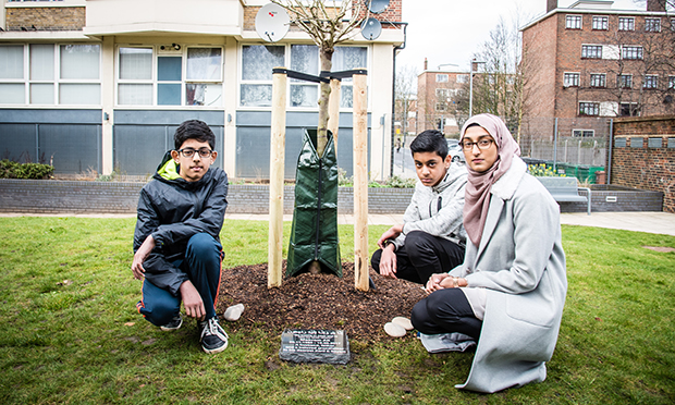 Family: Three of Makram Ali’s children with the plaque and tree. Photograph: Islington Council