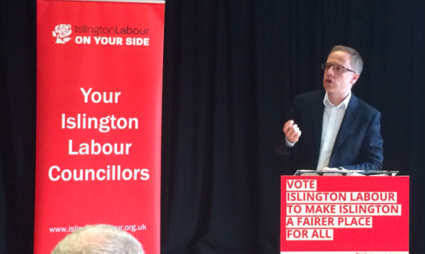 Islington Council Leader Richard Watts at Islington Labour’s manifesto launch, with Jeremy Corbyn sitting in the front row. Photograph: Islington Council