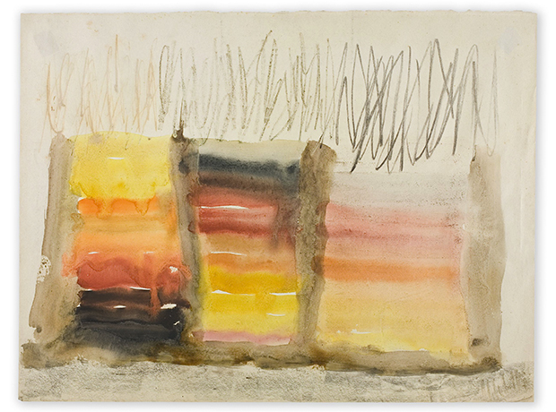 Strong vertical lines are a common refrain. Mainly straight, though sometimes curved or angled, vertical strokes define the paintings and sketches, and straight rods are recurrent features of much of the later sculptural work.