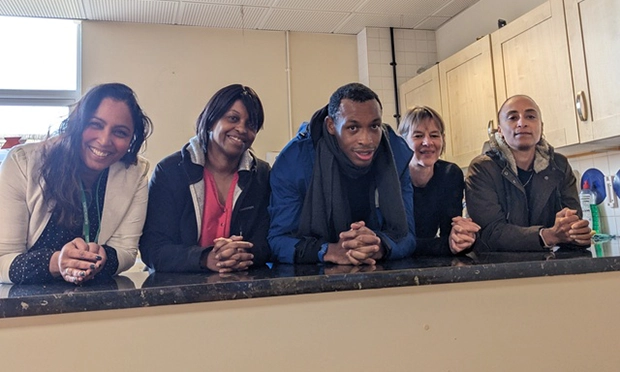 L-R: iSET’s Sheila Hart, Jemaine’s mother Sharon Williams, Jemaine Williams, and Hannah Woolhouse and Cheri Francill from the Almeida. Photograph: Julia Gregory